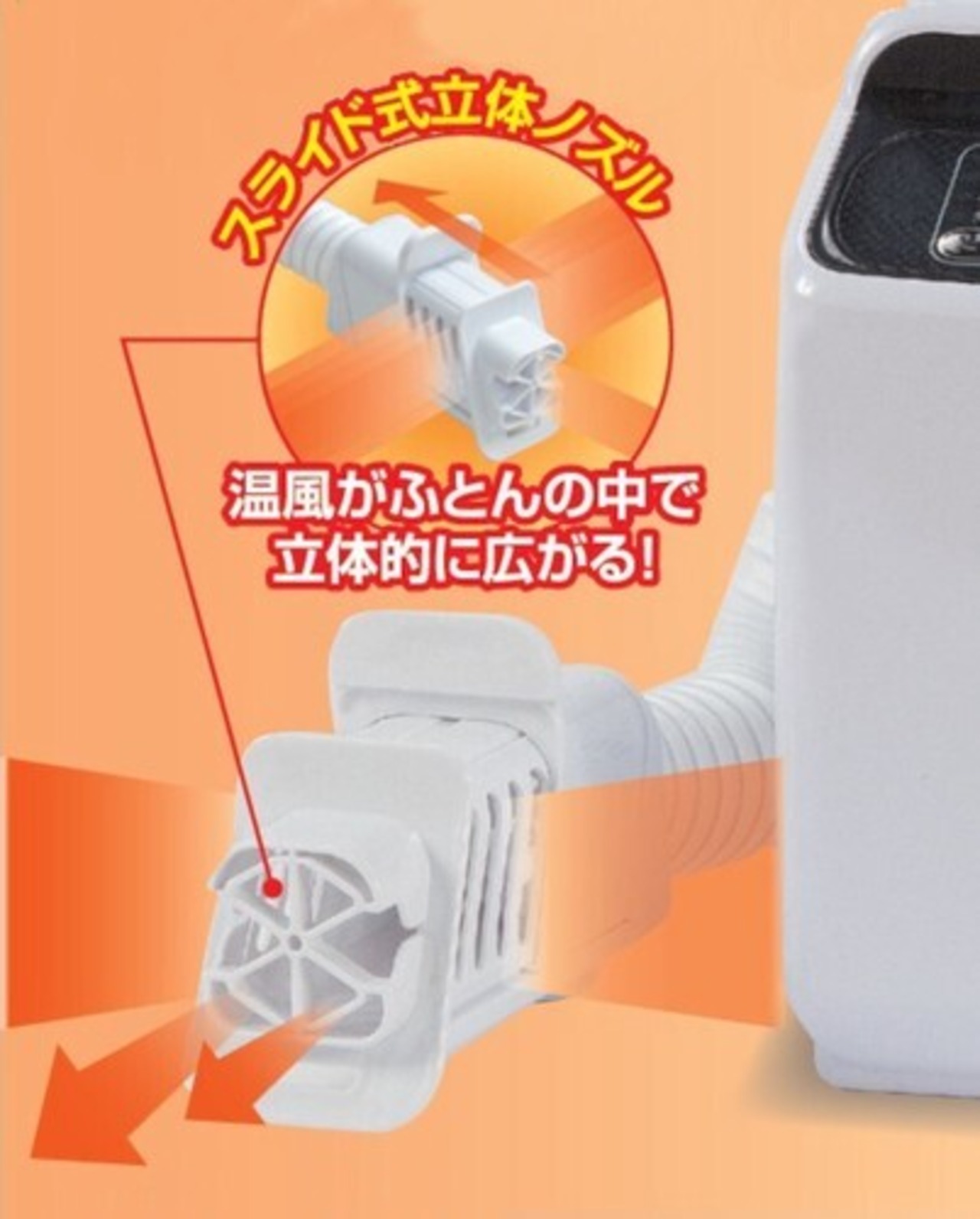 ●スライド式立体ノズル:温風がふとんの中で立体的に広がる!