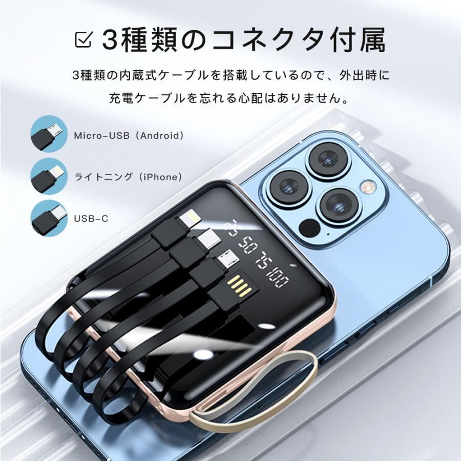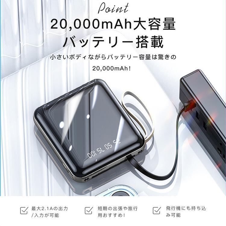 このモバイルバッテリーは、長時間の外出や旅行時に最適なアイテムです。携帯電話やタブレット、カメラなど、さまざまなデバイスを一度に充電できるため、効率的に充電管理ができます。