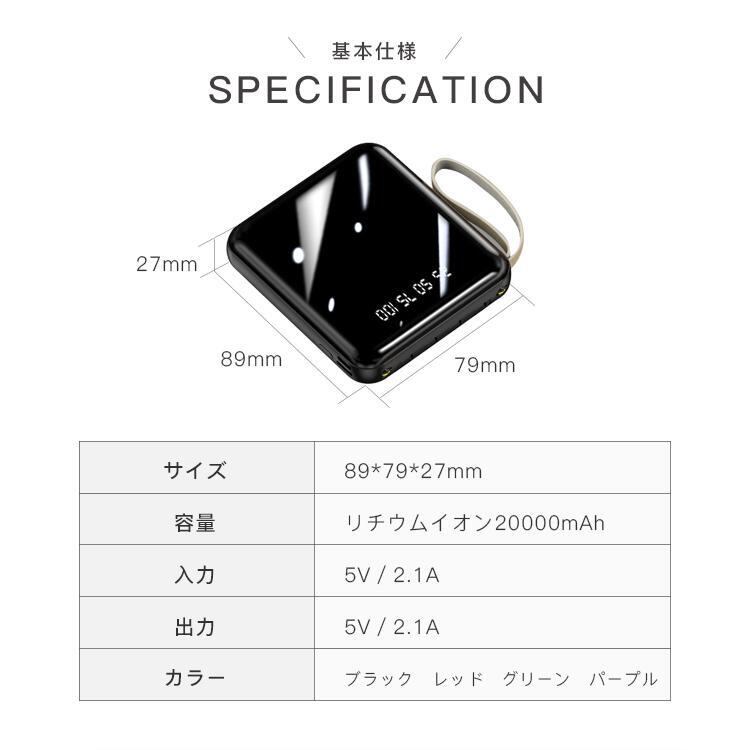 ■サイズ:89*79*27mm■容量:リチウムイオン20000mAh■入力:5V/2.1A■出力:5V/2.1A■カラー:ブラック、レッド、パープル、ピンク