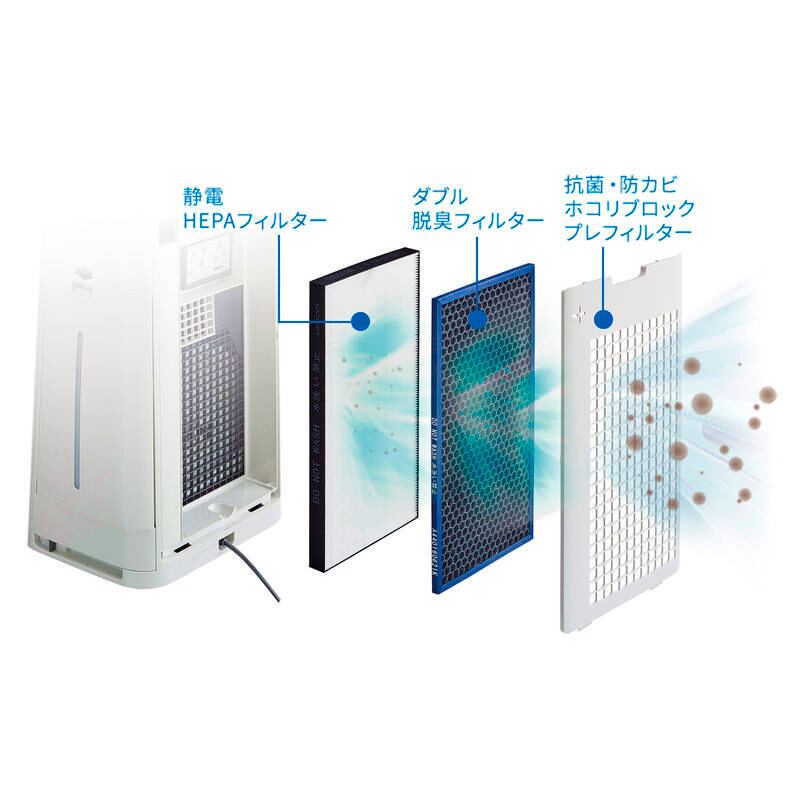 シャープ独自の空気浄化技術、プラズマクラスター25000を搭載。 【空気清浄】・花粉にもプラズマクラスター ・遠くのホコリも素早く吸じん「スピード循環気流」 ・3つのフィルターでしっかり脱臭・集じん 【加湿】 ・二層構造の加湿フィルターでたっぷり加湿。 ・たっぷり加湿なのに低騒音を実現。 ・キレイな水で加湿、Ag+イオンカートリッジ。 ●センサー/ニオイ・湿度・温度 ●モニター/デジタル温度・湿度・電気モニター、きれいモニター 〔適用畳数〕・プラズマクラスター25000/約13畳 ・空気清浄/~23畳 ・加湿/(プレハブ洋室)~17畳、(木造和室)~10畳