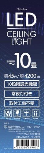 10畳用LEDシーリングライト HLCL-002K 昼白色 10段階 調光タイプ リモコン付き 調光機能 節電 薄型